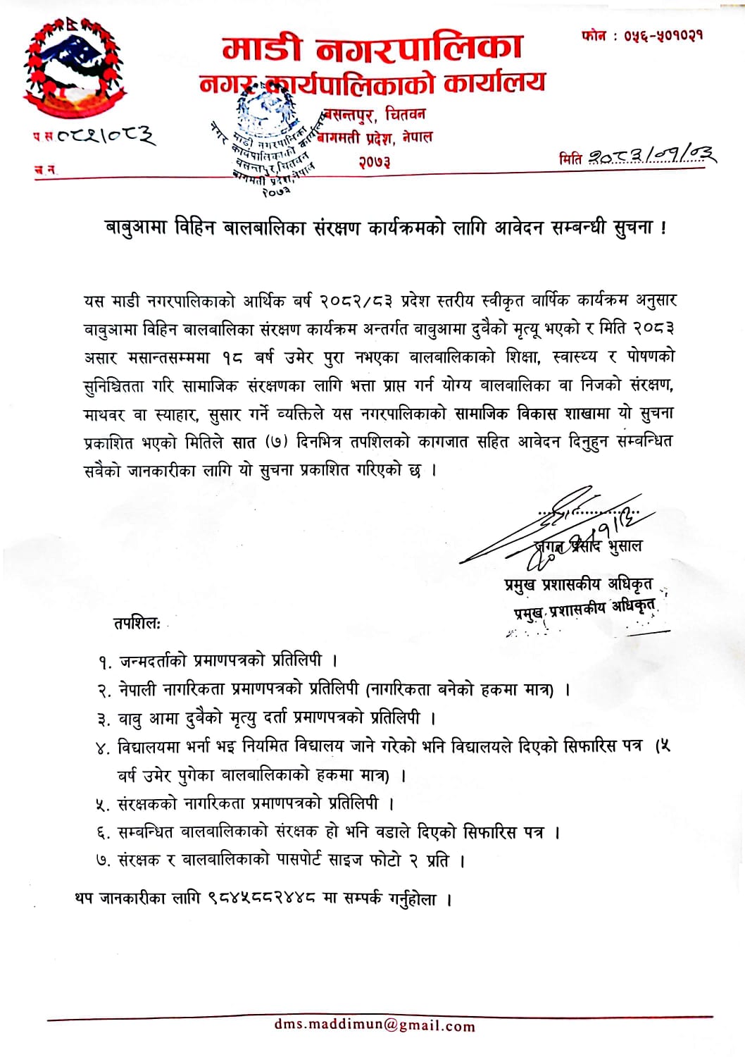 बाबुआमा विहिन बालबालिका संरक्षण कार्यक्रमको लागि आवेदन सम्बन्धी सूचना