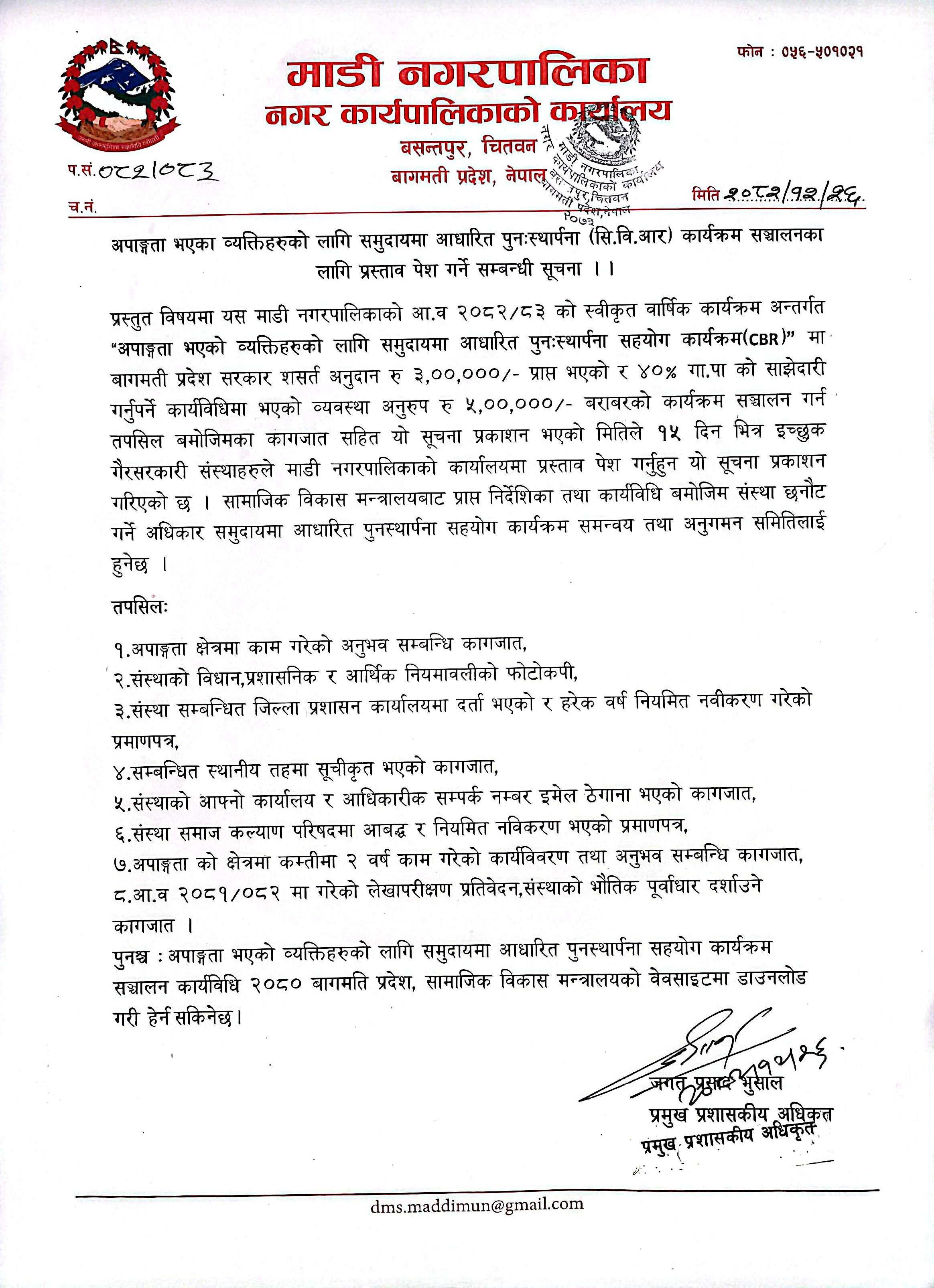 अपाङ्गता भएको व्यक्तिहरुको लागि समुदायमा आधारित पुनर्स्थापना सिविआर कार्यक्रम सञ्चालनका लागि प्रस्ताव पेश गर्ने सम्बन्धी सूचना