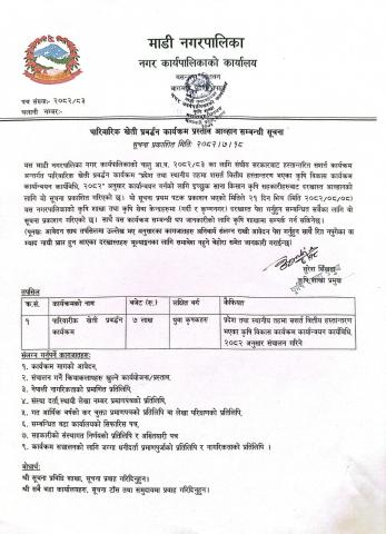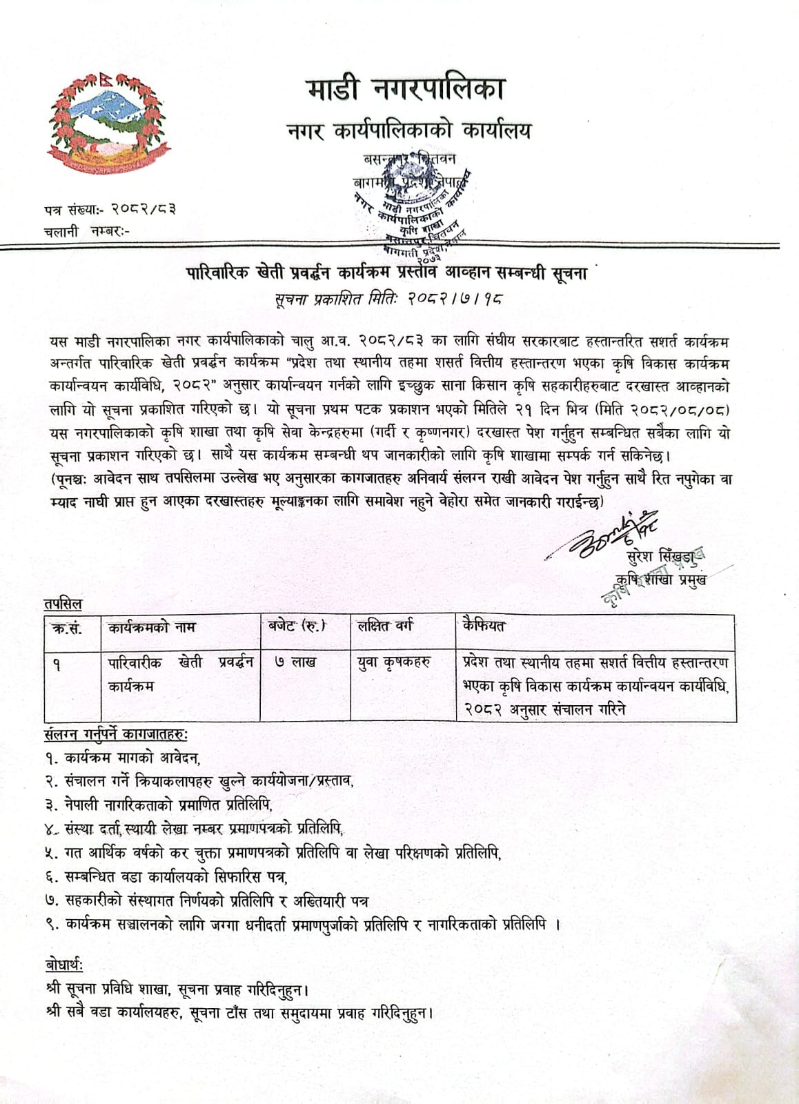 माडी नगरपालिका कृषि शाखाको पारिवारिक खेती प्रबर्धन कार्यक्रमका लागि प्रस्ताव आव्हान सम्बन्धी सूचना