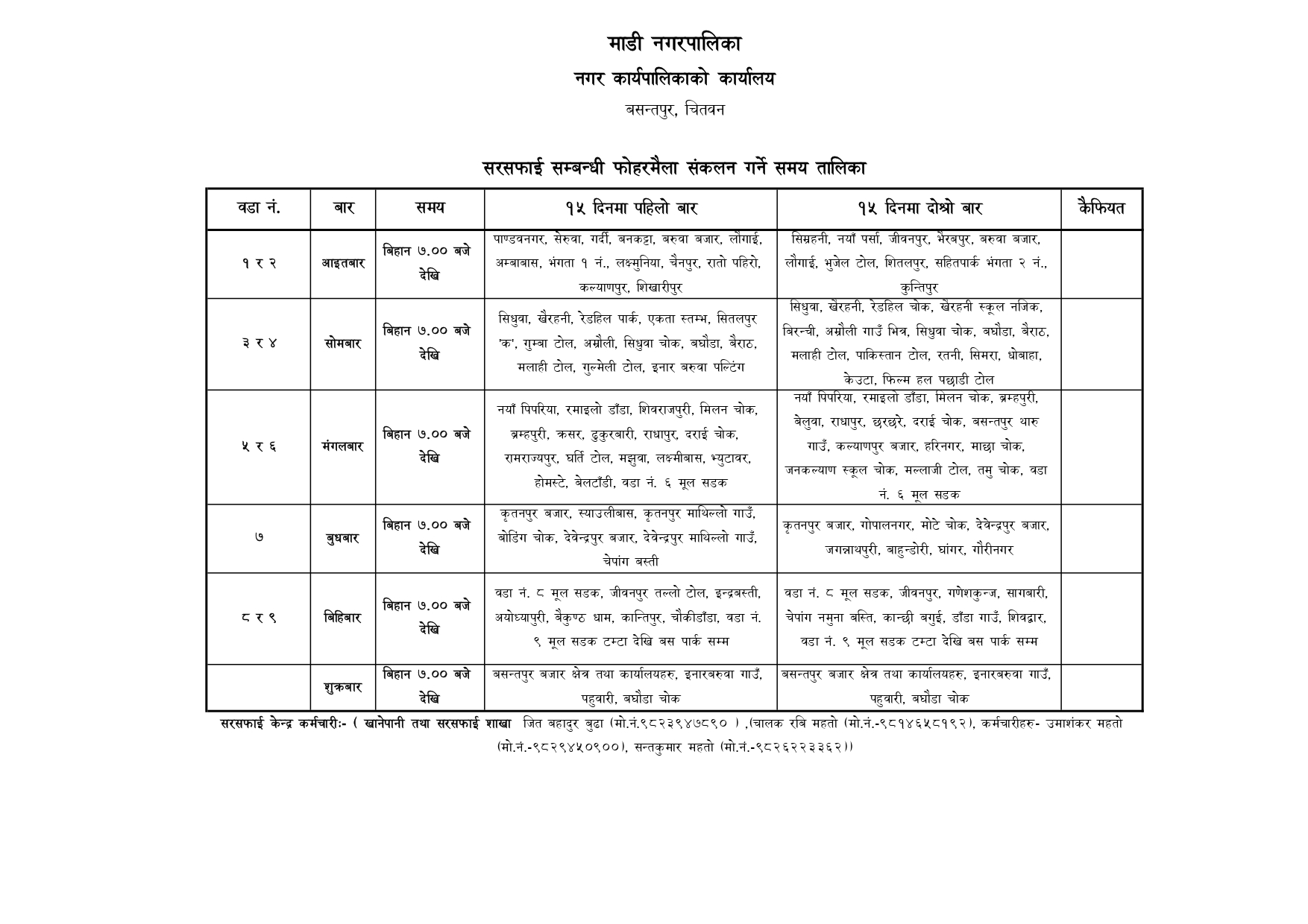 सरसफाई सम्बन्धी फोहोरमैला संकलन गर्ने समय तालिका