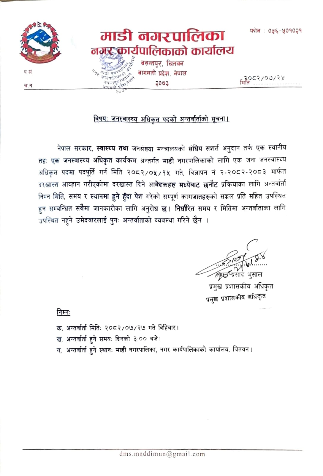 जनस्वास्थ्य अधिकृतको पदकाे अन्तर्वार्ताकाे सूचना